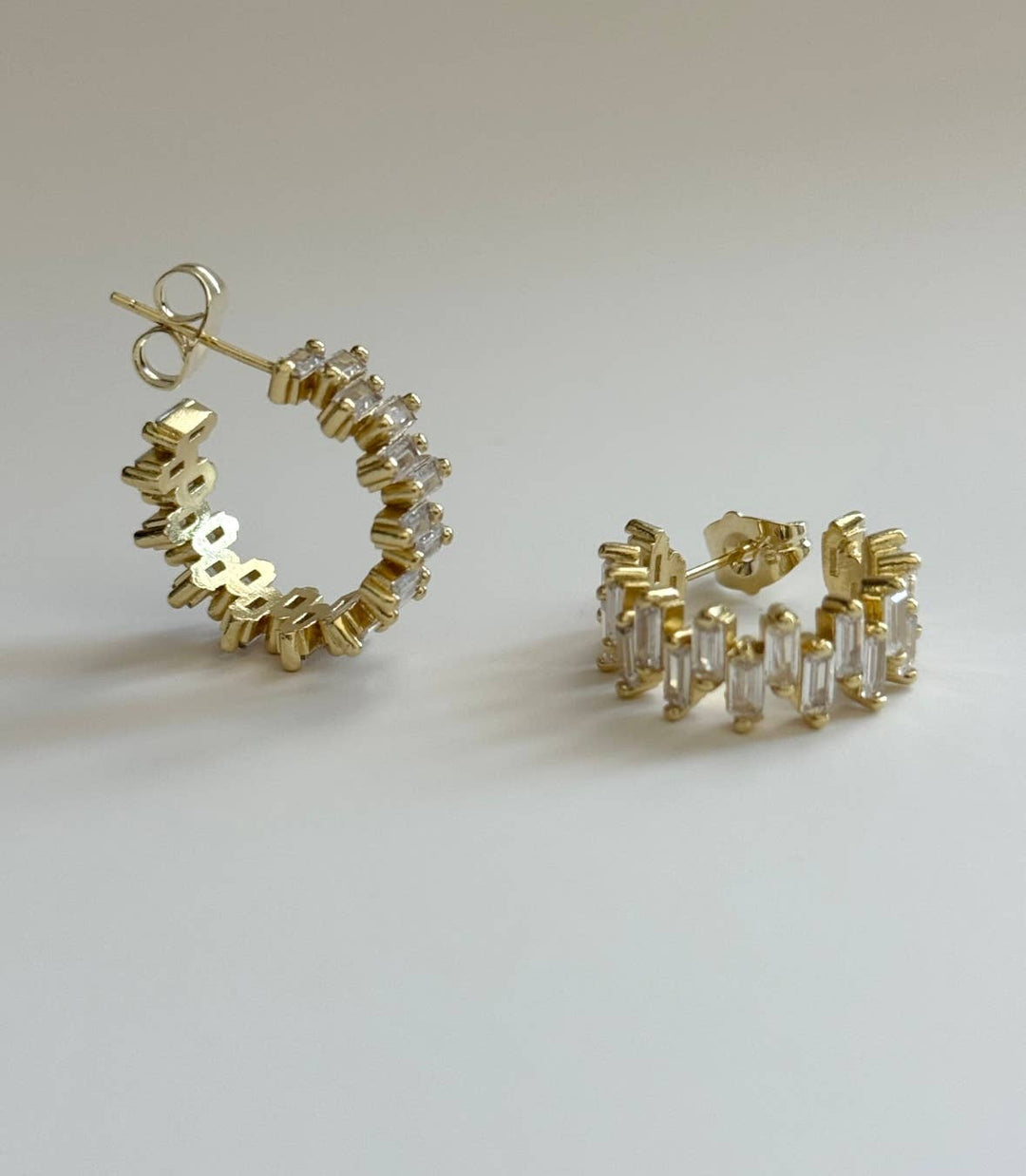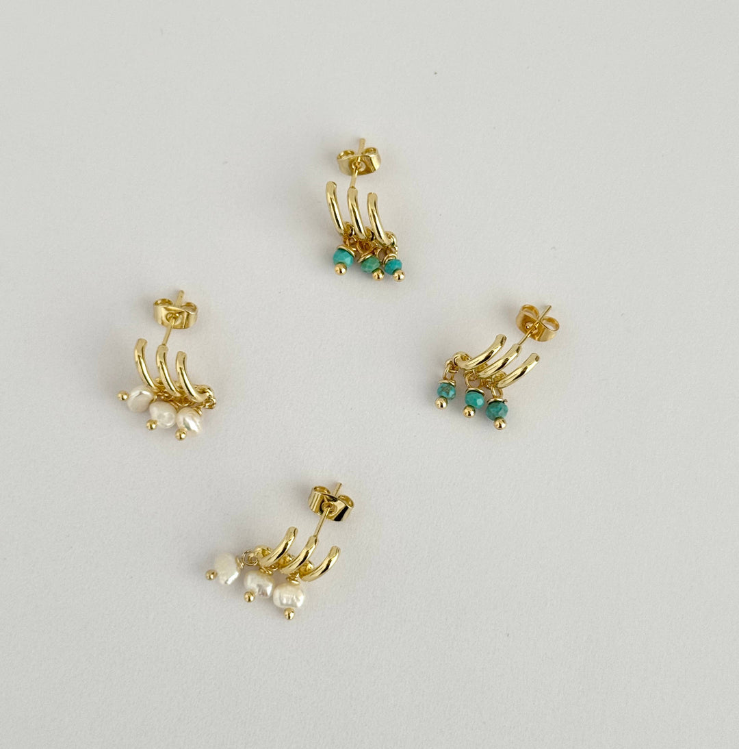Woman sitting on a wooden crate on a beach with a green bandana and patterned leggings.