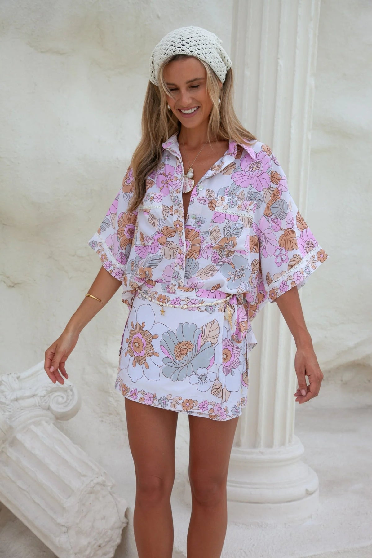 The Celeste Wrap Skirt in White Floral is a wardrobe essential made for warm, sunlit days. Crafted from 100% soft rayon, this wrap-style skirt drapes beautifully and ties at the waist for a flattering, adjustable fit.  Pairs effortlessly with the matching Celeste Blouse for an elevated yet relaxed look. Ideal for brunch dates, coastal strolls, or weekend getaways.