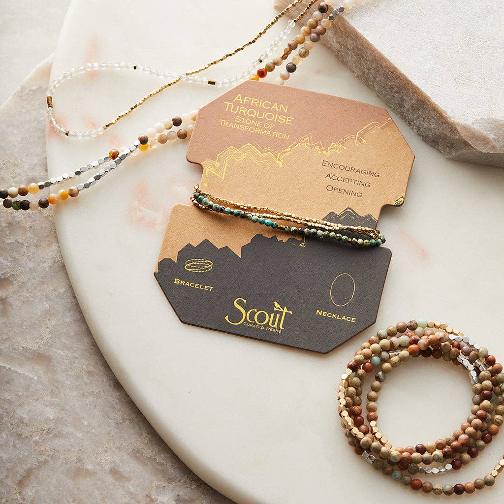 The design can be worn as a single-strand necklace or wrapped three times around the wrist for a stacked bracelet look. The stones are strung on a stretch cord, providing an easy and comfortable fit.
