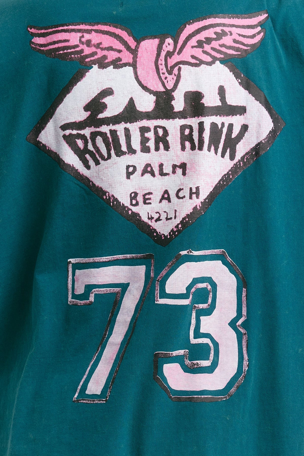 • Dual-Sided Graphic Art: Features custom hand-drawn flying skate artwork on the chest and vintage "Sabbi Roller Rink - Palm Beach" branding on the back.7