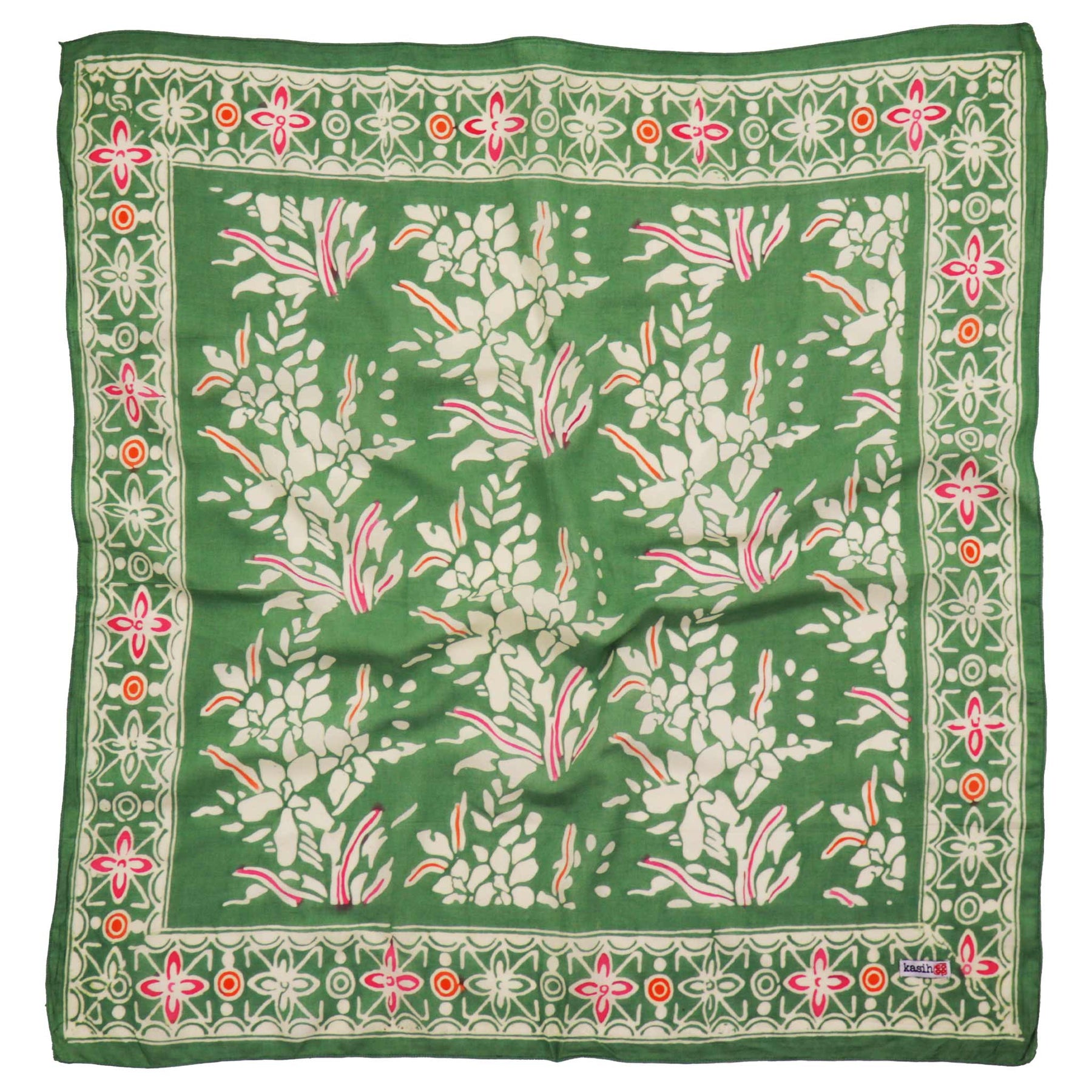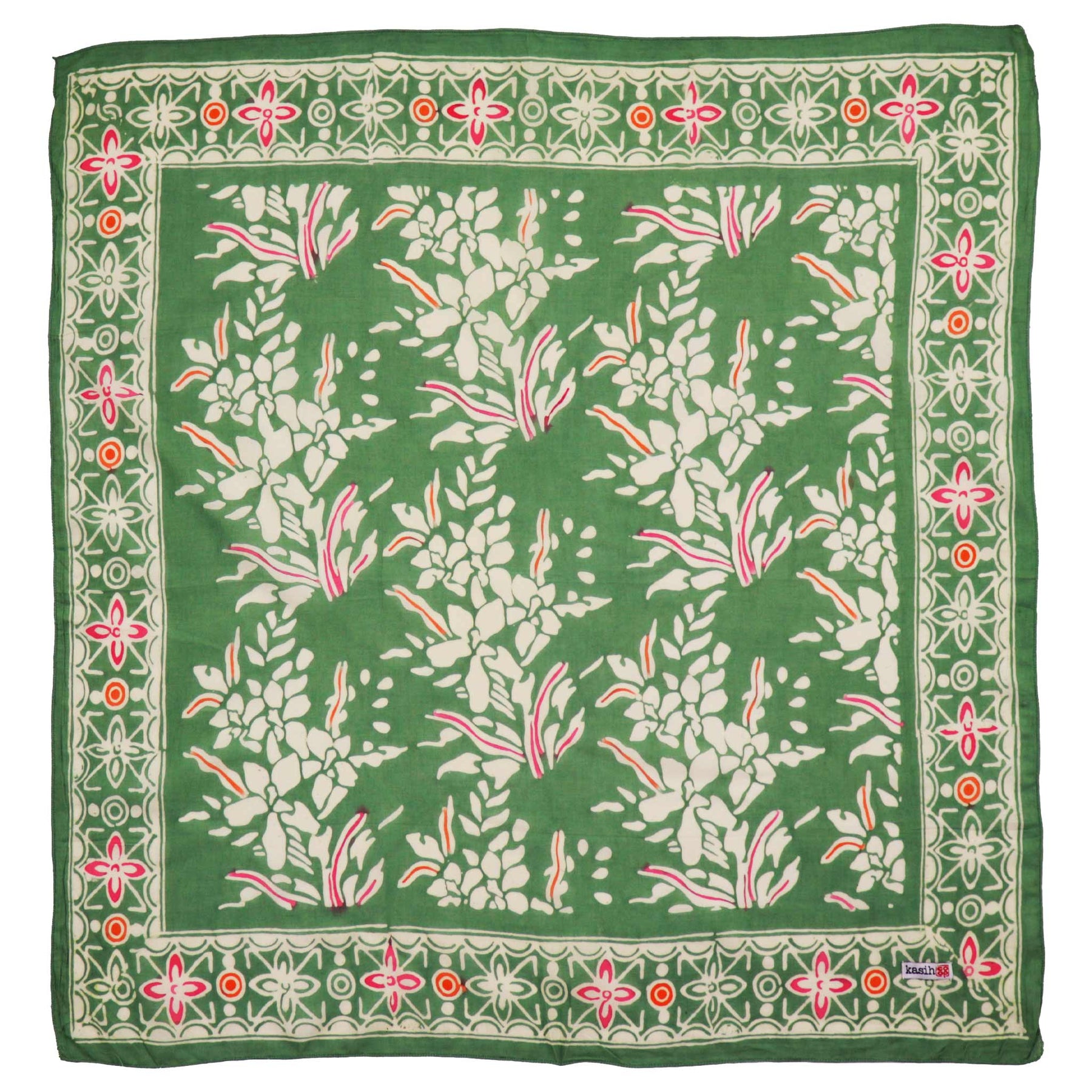 Experience authentic craftsmanship with the Green Garland Batik Bandana, a unique, wearable piece handmade by skilled artisans in Java using the centuries-old wax and dye batik technique.