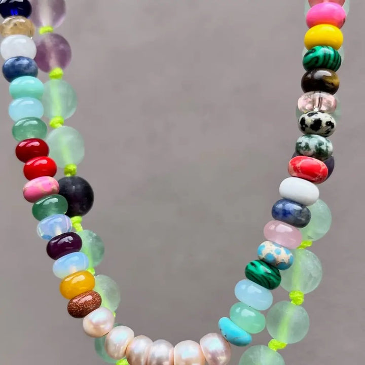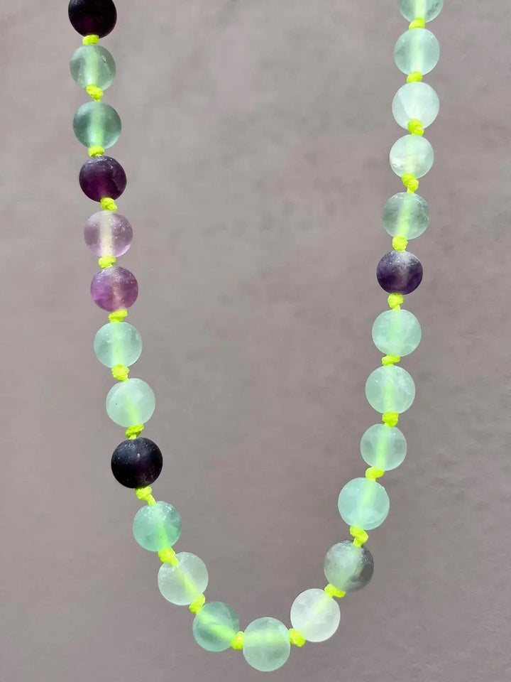 The Neon Knotty Necklace is a beautifully handcrafted accessory made with vibrant matte fluorite stones and intricately hand knotted using a striking neon yellow satin thread. This unique piece features a convenient loop and bead closure for ease of wear. With a length of 18 inches, it sits perfectly to enhance any outfit, making it a standout addition to your jewelry collection.