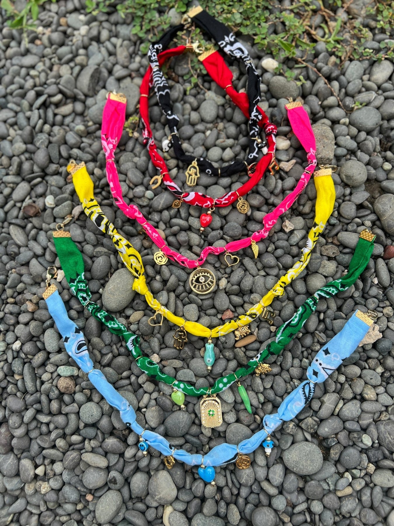 Our Summer Necklace-Bandana Necklace-Fabric Charm Necklace-Boho perfectly captures the vibrant coastal cowgirl spirit with its unique blend of stylish geometric shapes inspired by nature’s elements. This necklace combines innovative design with traditional craftsmanship, wrapped in a lively burst of color that enhances any outfit. Its boho chic style makes it more than just an accessory—it’s a wearable piece of art that expresses your individuality and free-spirited vibe. Elevate your look and embrace the essence of summer with this captivating, versatile necklace.