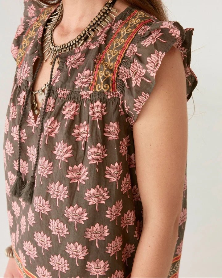 The flutter sleeves add just the right amount of movement, while the intricate embroidery along the shoulders speaks to craftsmanship that refuses to be rushed. A border print in deep red and gold frames the hem, an unexpected contrast that keeps things sharp, never sweet.