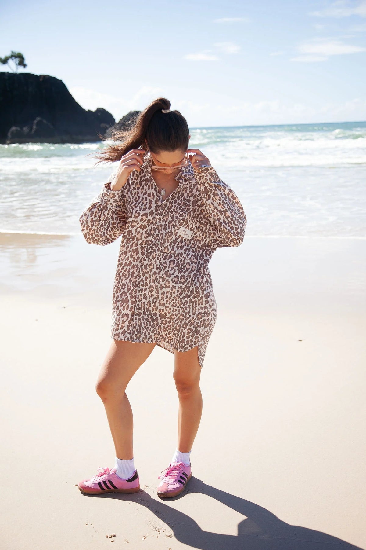 Introducing our Tigeress leopard print boyfriend fit oversized shirt dress in a linen rayon medium weight fabric . The shirt dress boasts long sleeves for the cooler weather, a patch front pocket detail with a branded Palm Collective woven label. A softer leopard print perfect to pair back with sneakers, or ankle boots.