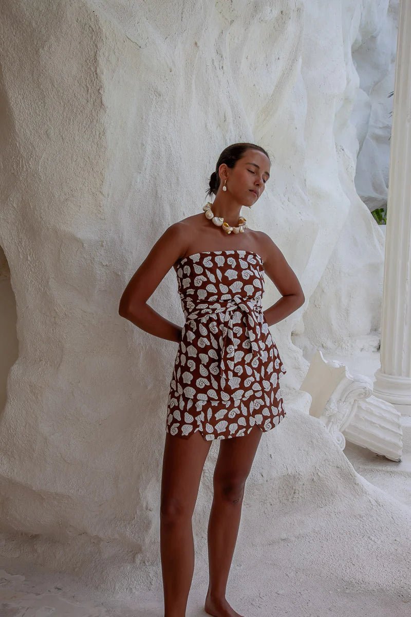 Introducing our new 'Shell Collection' top in our shell array print. The ultimate must-have for effortless summer styling. Made from a soft Cotton Angel fabric, this top is lightweight, breathable, and perfect for warm-weather days. Featuring a strapless neckline and an open back, it features a flattering, feminine silhouette that’s both comfortable and eye-catching. The adjustable tie-back closure and bow detail allows for a custom fit that hugs in all the right places. Pair with our matching Tide Pool skirt for the perfect duo.