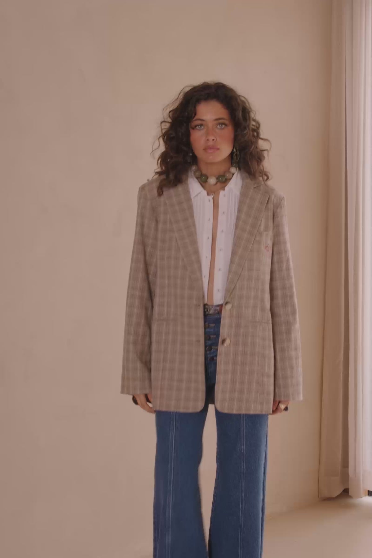 The Arizona Blazer in Check is a striking blend of classic tailoring and modern edge. Crafted from a sustainable Organic Cotton and Hemp blend, this blazer features an oversized fit with wide, padded shoulders that exude effortless sophistication. The single-breasted design is finished with a central button closure, chest welt pocket, and sleek front jet pockets, while cuff buttons and customised placement embroidery add unique, thoughtful details.