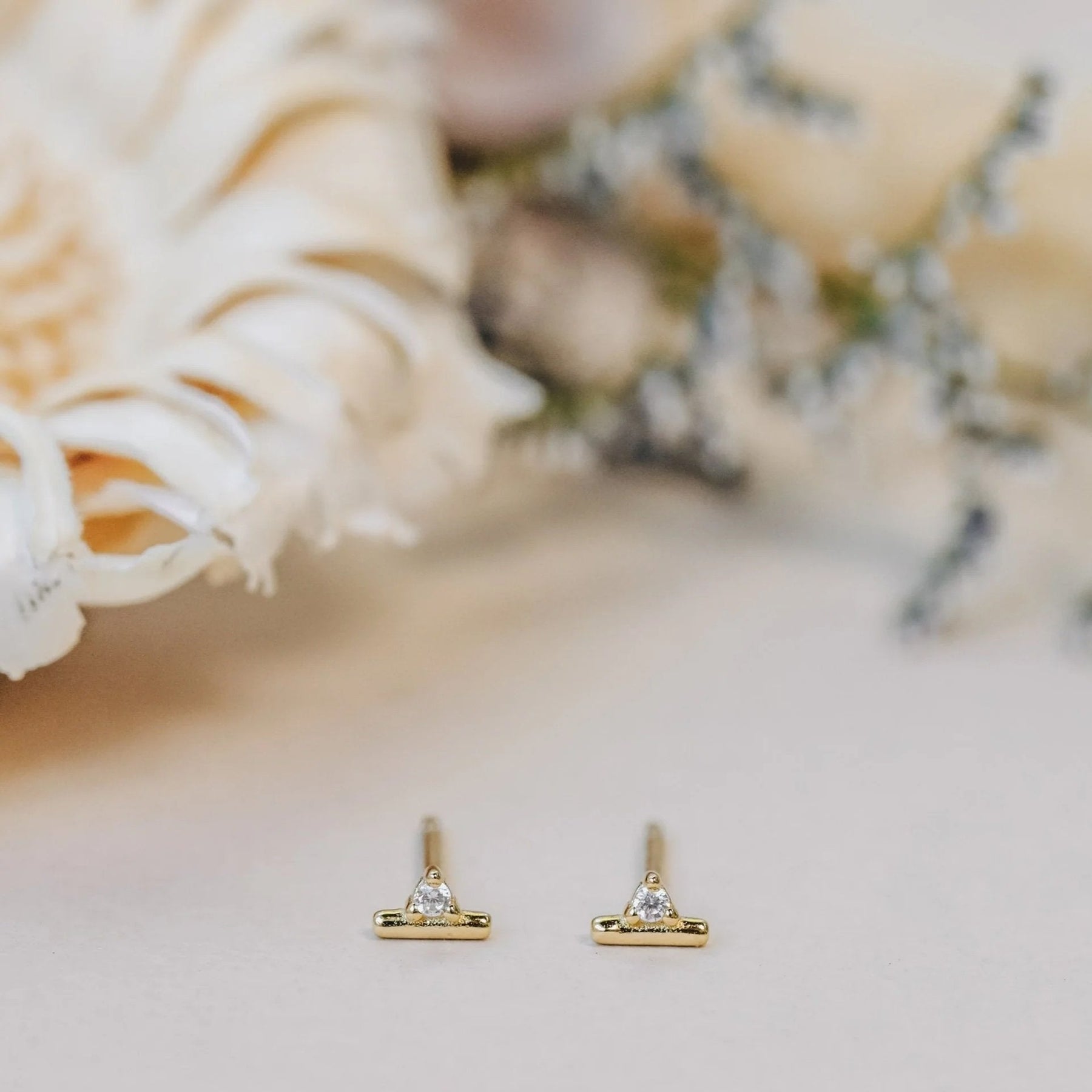 A simple gold bar has a round sapphire CZ stone. It won't tarnish thanks to a protective coating that keeps it safe from sweat and water. The posts are made of sterling silver with 18K gold plating over brass. It's hypoallergenic and lead-free. The bar is about 4mm.
