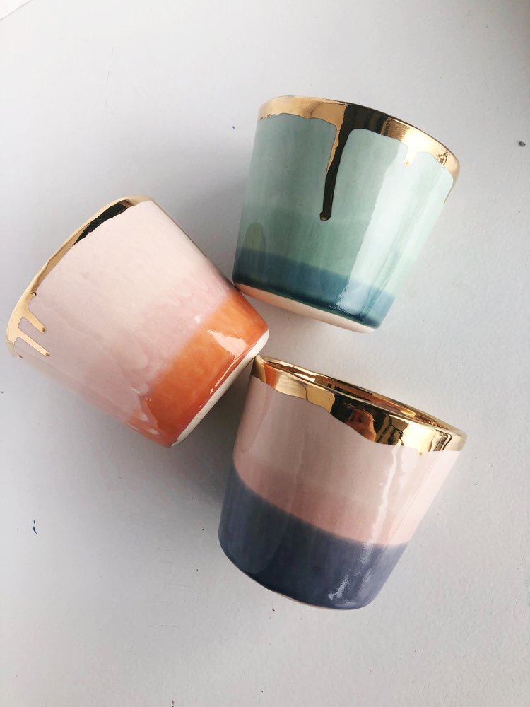 The jaw-dropping Desert Tumbler is handmade from Porcelain clay. Each tumbler is dipped in a custom blend of four glazes, to create the beautiful desert palette. The special edition tumblers are finished in a 22k gold luster rim, making them perfect as a special gift! Tumblers measure approximately 3"H, 3"D and hold 8oz hot or cold liquid - perfect for cocktails or matcha! Tumblers are NOT microwavable, and hand washing is recommended.