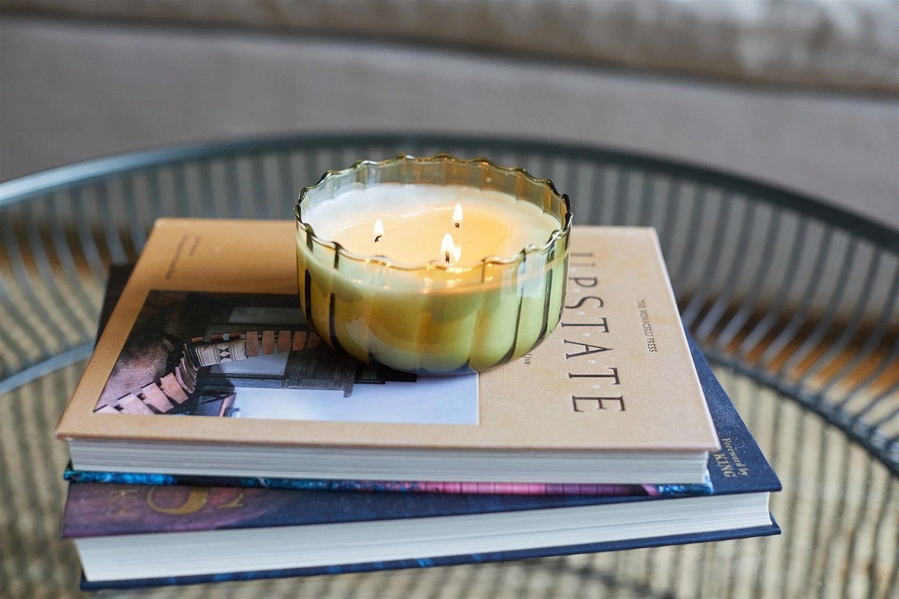 The Ripple - Secret Garden 12oz Candle adds charm to your dining table. Its colored glass vessel features a vintage style.