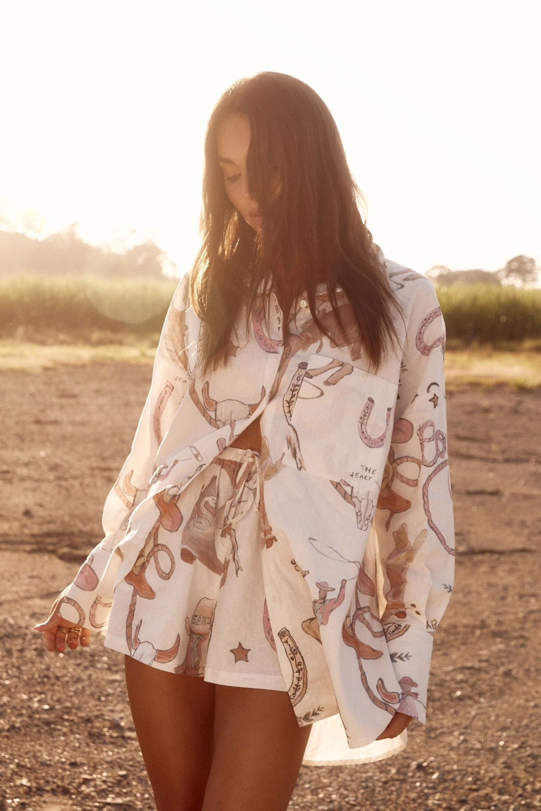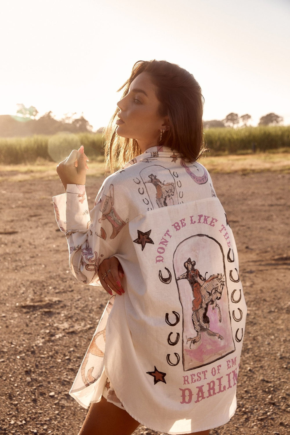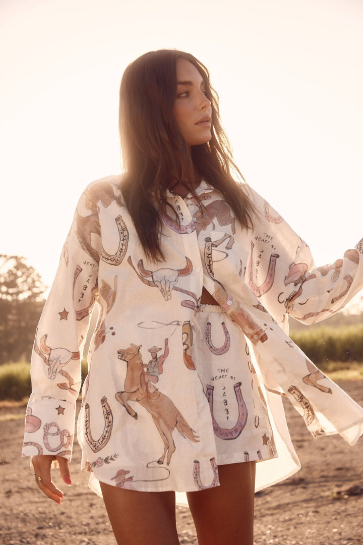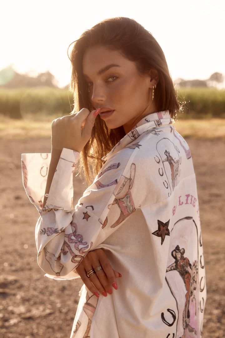 This isn't Texas, but Beyonce will eye you in this print. Made from luxurious linen, this oversized button-up features side splits, short sleeves, and a Margarita lovers quote on the back. Note that print placement varies by shirt. Designed to be very oversized; size down 1 or 2 sizes for a less roomy fit.