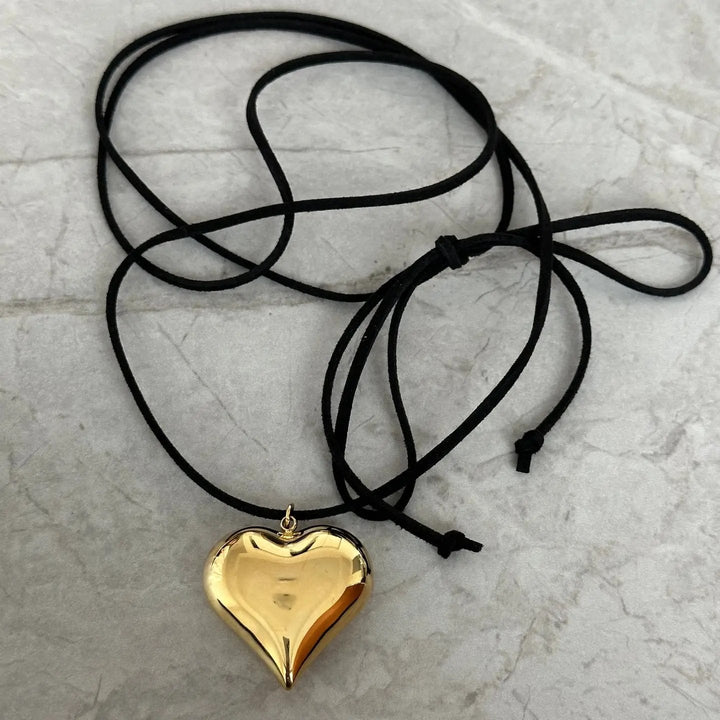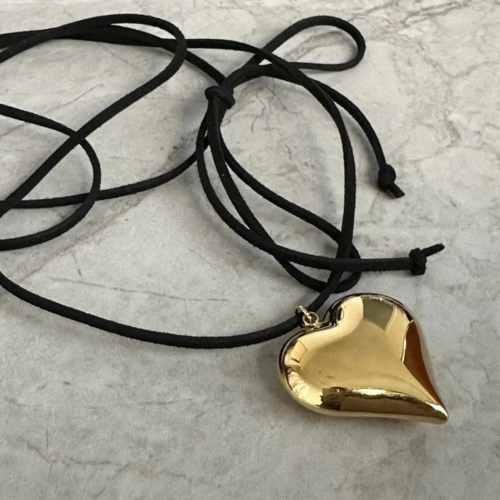 The double wrap heart features an oversized gold heart pendant. We recommend wrapping this style around twice to have the bow in the front.